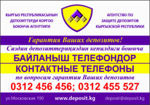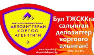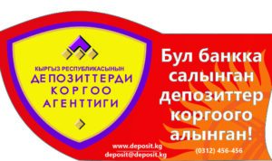 — “Кыргыз Республикасынын депозиттерин коргоо боюнча агенттиги. Бул банкта, микрофинансылык компанияда (МФК), Турак жай-сактык кредиттик компанияда (ТСКК) салынган аманаттар коргоого алынган» кыргыз тилинде (3,4,5,6-тиркемелер);