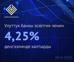 Правление Национального банка Кыргызской Республики 27 января 2020 года приняло решение сохранить учетную ставку (ключевую ставку) на уровне 4,25 процента. Решение вступает в силу с 28 января 2020 года.